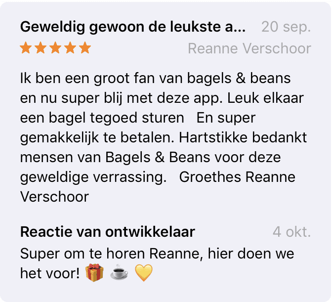 De app is erg succesvol onder de Bagels & Beans fans. Het heeft een gemiddelde rating van 4.8 en een hele hoop mooie reviews! Een aantal van deze trotsmakende reviews presenteren wij graag: